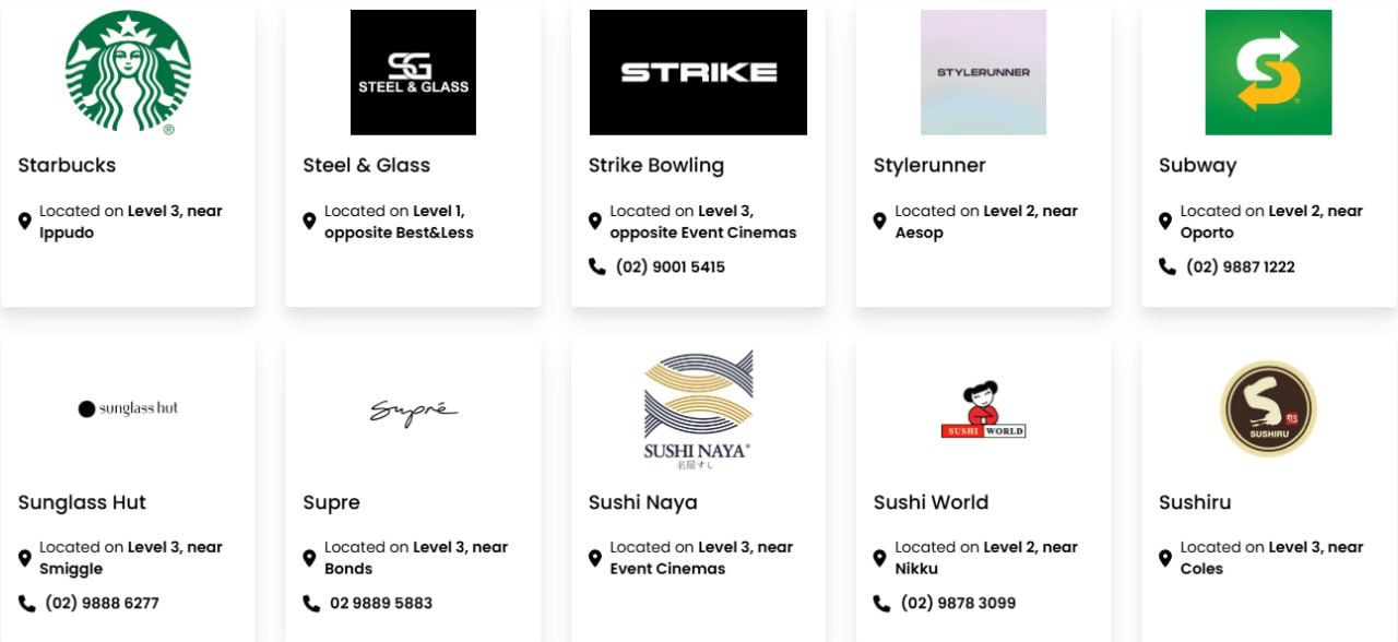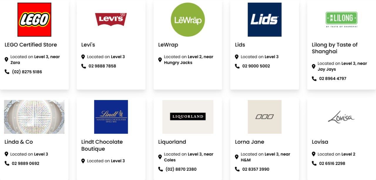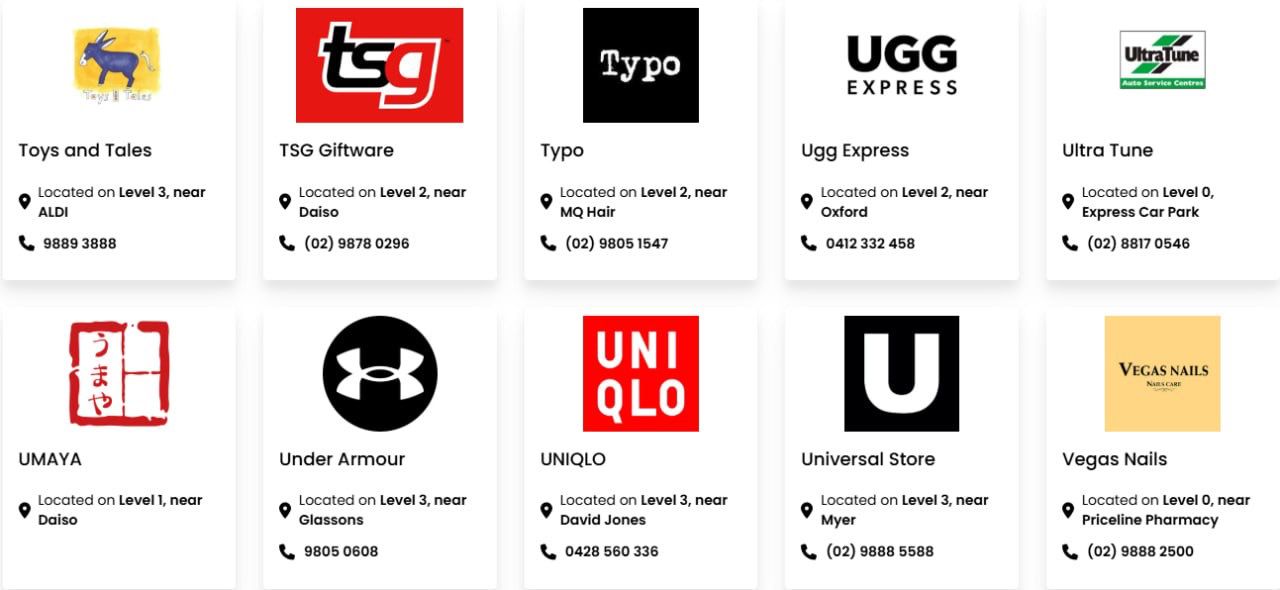 Macquarie Centre has 134,900m² of floor space. The major retailers include David Jones, Myer, Big W, Kmart, Aldi, Coles, Woolworths, Cotton On, H&M, Uniqlo, Zara, JB Hi-Fi, Rebel, Fitness First, Timezone, Strike Bowling Bar, Macquarie Ice Rink and Event Cinemas.